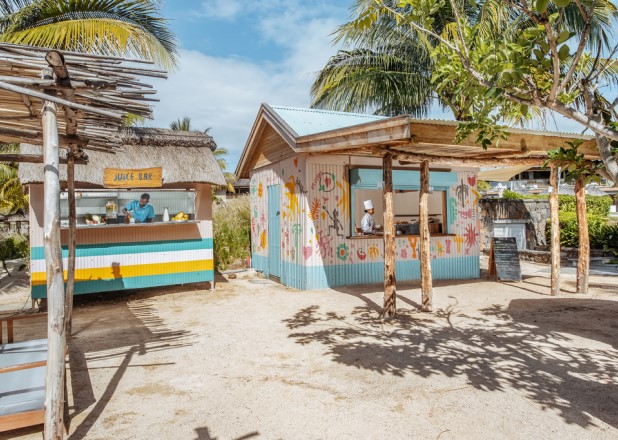 mauritisches Street Food authentisch, buntes Kiosk mit den Füßen im Sand