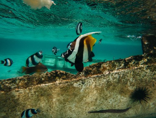 Suivez notre sentier sous-marin en snorkeling et découvrez la vie marine qui se cache sous la surface à bord d’Ekol’O, notre plateforme d’éducation marine. Pouvez-vous repérer nos panneaux éducatifs sous-marins ?