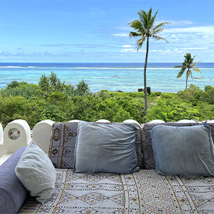 On y vit dehors, les pieds nus, entre lumière du matin et reflets clairs du lagon.
